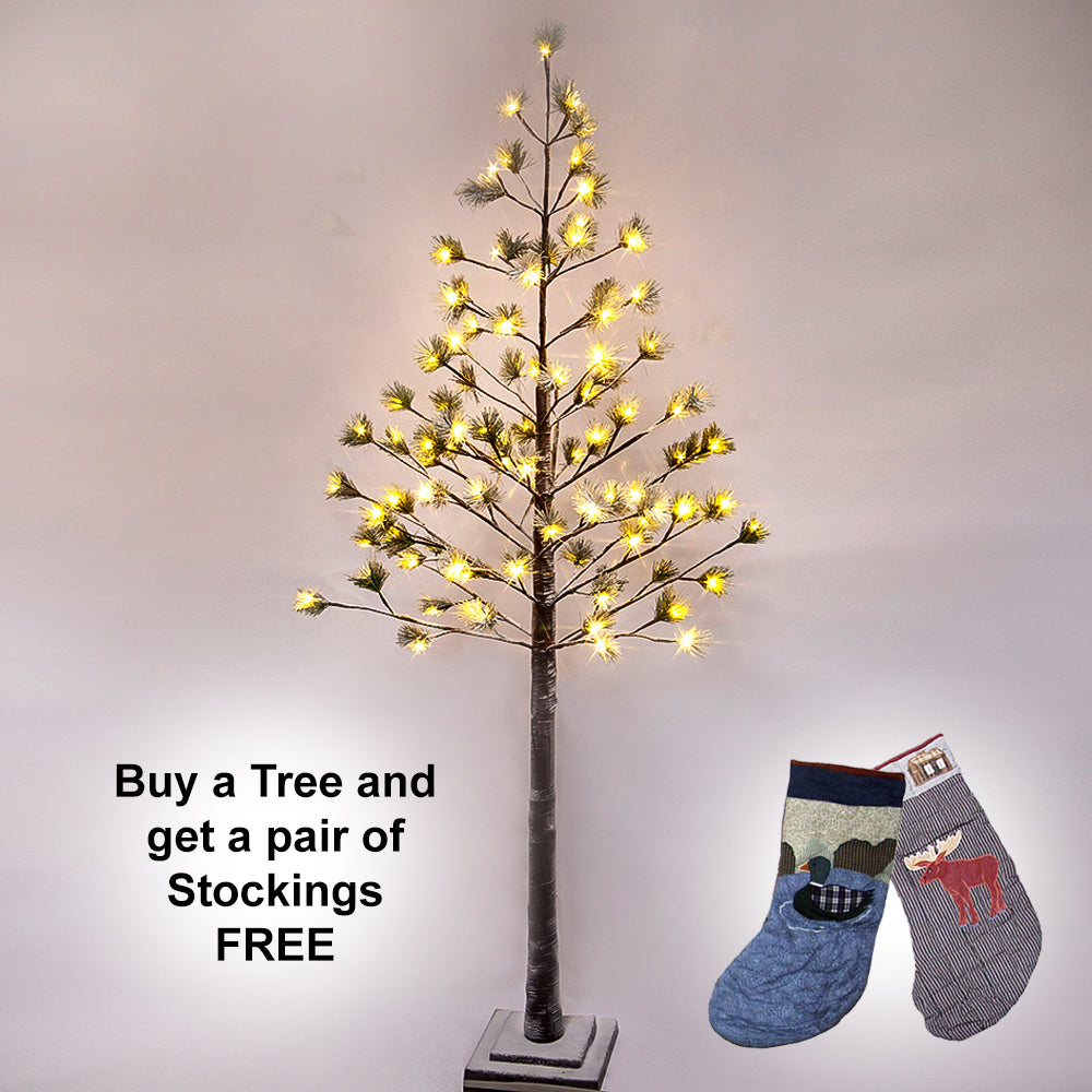 6-Ft Prelit Artificial Pine Christmas Tree with 96 Warm White LED Lights, Realistic Green Needle Leaves, Indoor & Outdoor, Adjustable Branches, Square Base – Buy a Tree and get a Pair of Stockings