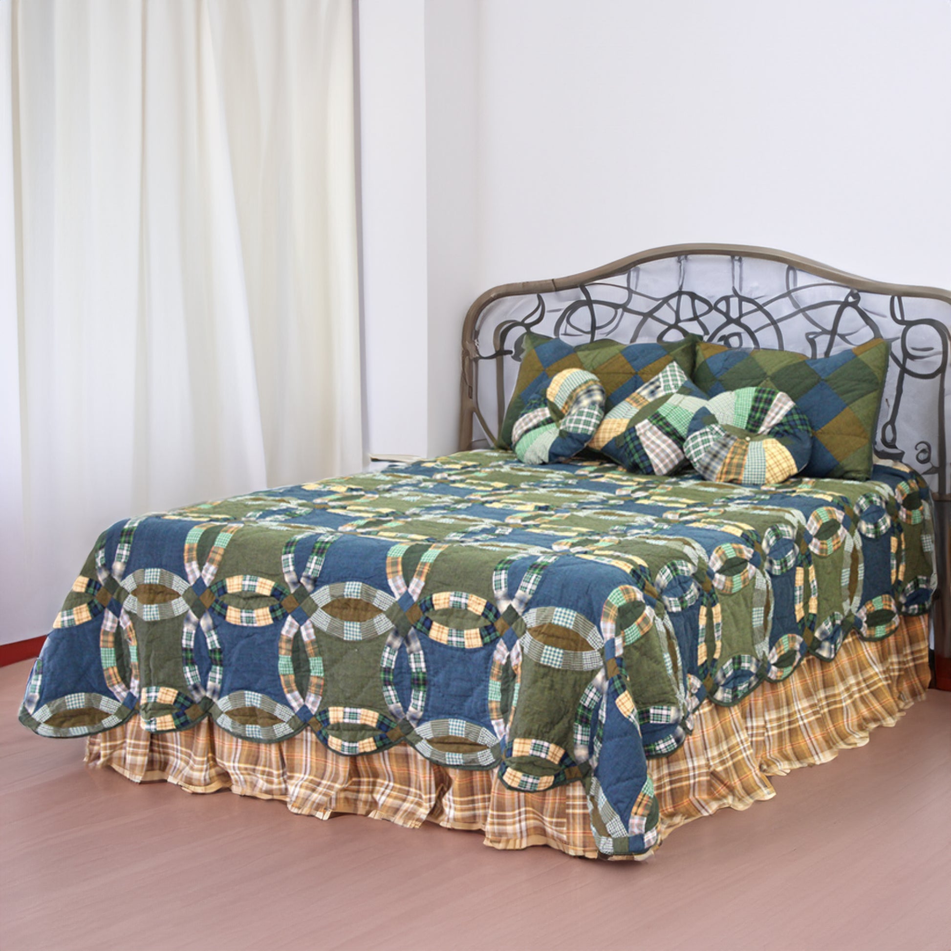 This Quilt having the double ring wedding pattern which in turn also forms the oval shaped patterns adjoining them giving a blended beauty of chambray fabrics of home spun cotton checks.