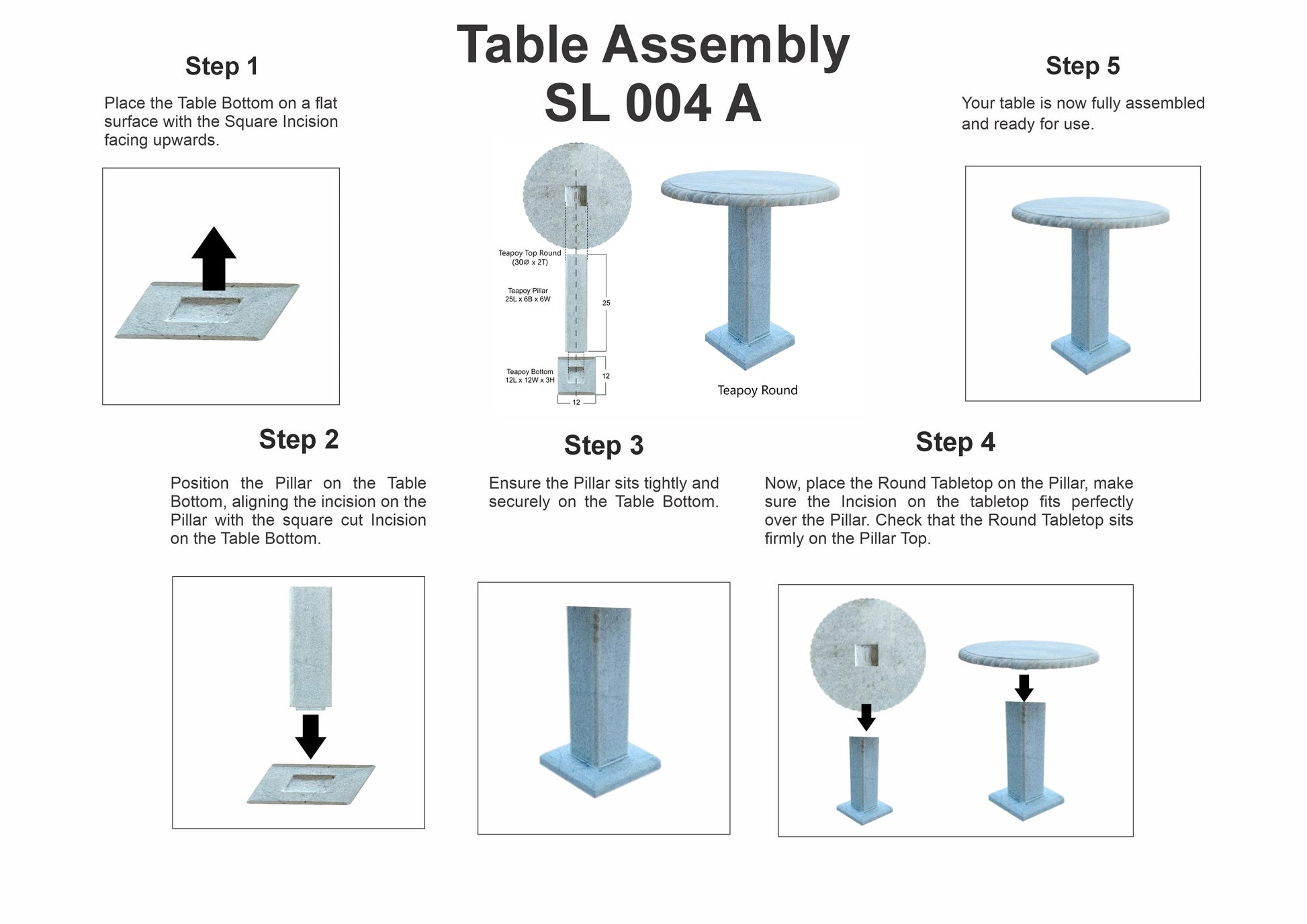Step 4 - Now, place the Round Tabletop on the Pillar, make sure the Incision on the tabletop fits perfectly over the Pillar. Check that the Round Tabletop sits firmly on the Pillar Top.
