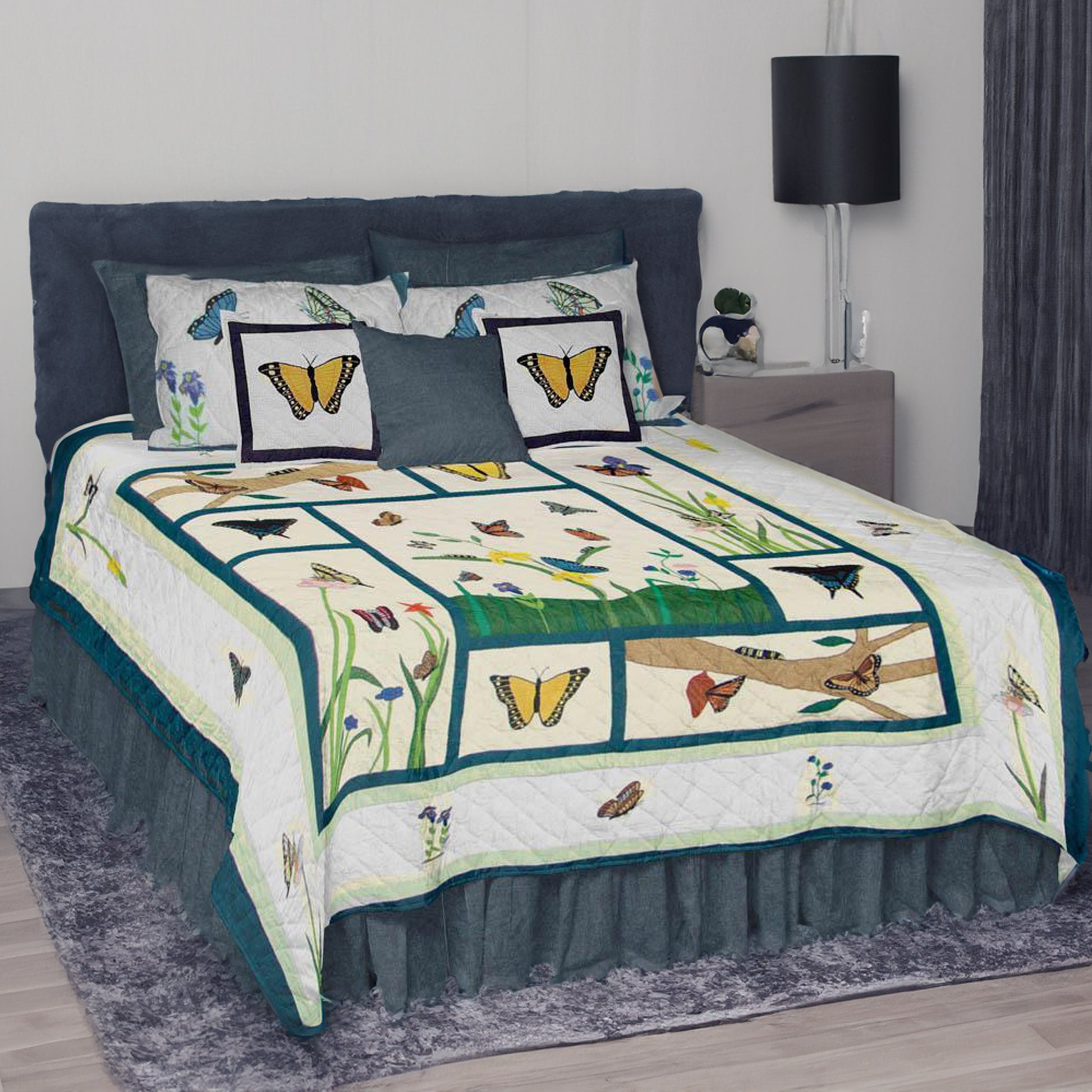 Butterflies of various colors, some sitting on the flowers ready to suck honey with their spiral tubed mouth while fluttering their wings; worm-shaped caterpillars slowly moving on the brown branches patched on the Quilt will make the room lively, bringing relaxation and happiness to the tired who return home after a hard day's work, removing your worries. The fluffed hand-layered organic cotton fill and soft cotton fabric shell are extraordinarily soft, warm, comfortable, and cool. Our quilts are hand appliquéd using real appliqué parts and are not printed. It is hand-quilted rather than machine-quilted. We provide 100% original traditional quilting. The quilt's reverse is composed of homespun cloth, while the backing is made of yarn-dyed fabric.