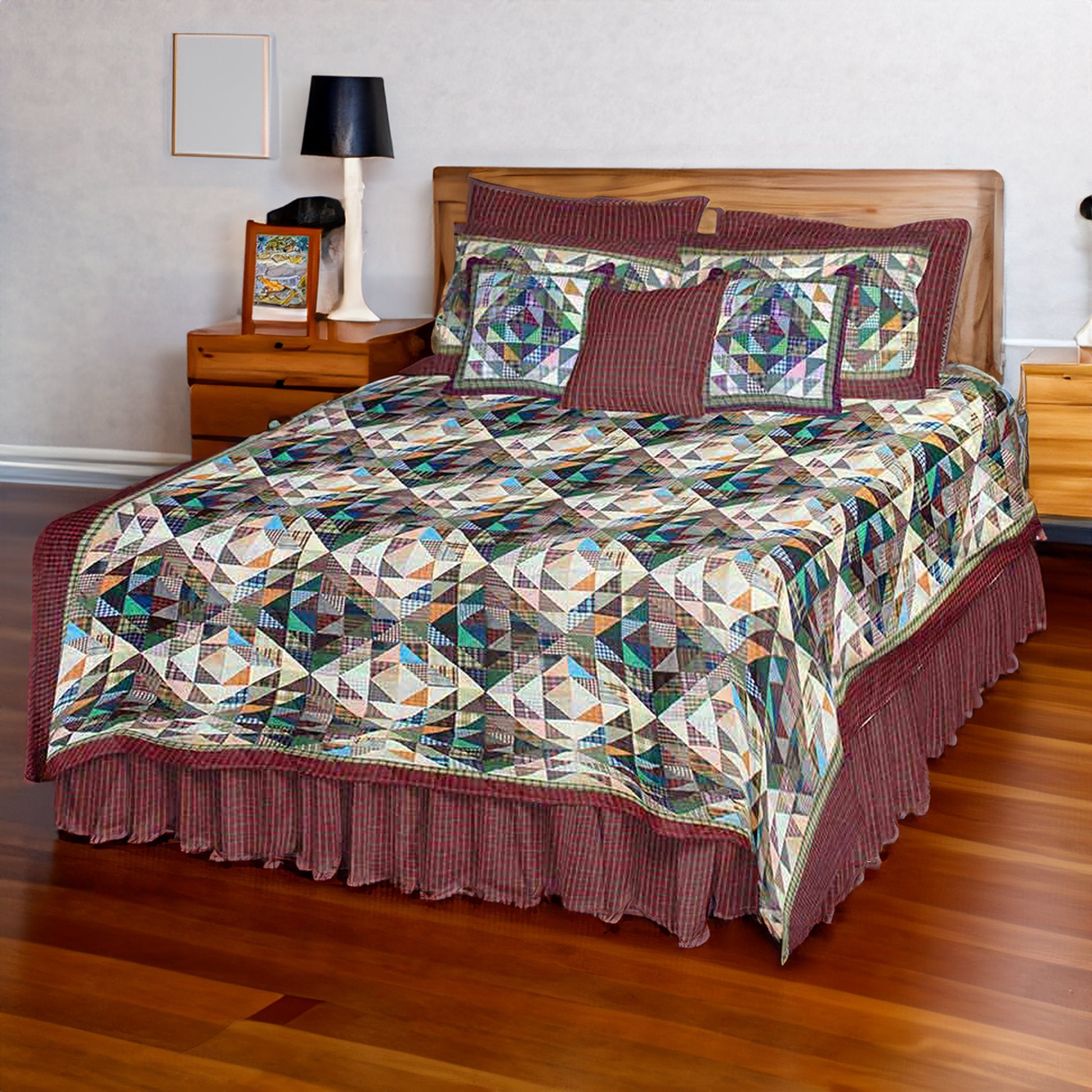 This red bordered quilt with multicolored rayed squares will adorn your bed beautifully, with the variegated prismatic shattered dishes pattern exuding a new breath of various hued colors. The fluffed hand-layered organic cotton fill and soft cotton fabric shell are extraordinarily soft, warm, comfortable, and cool. Our quilts are hand appliquéd using real appliqué parts and are not printed. It is hand-quilted rather than machine-quilted. We provide 100% original traditional quilting. The quilt's reverse is composed of homespun cloth, while the backing is made of yarn-dyed fabric.