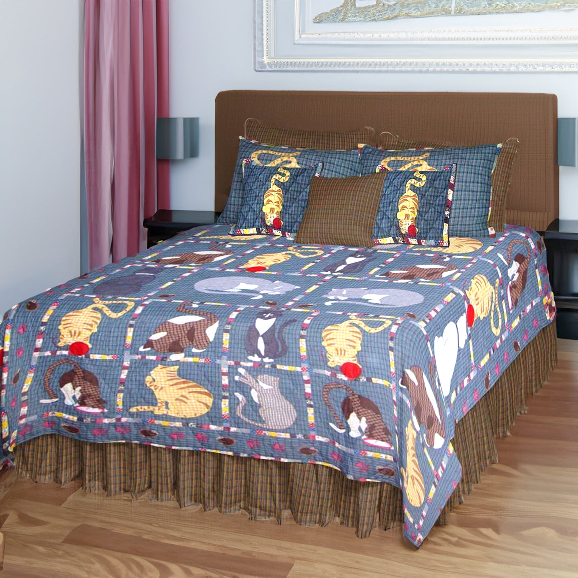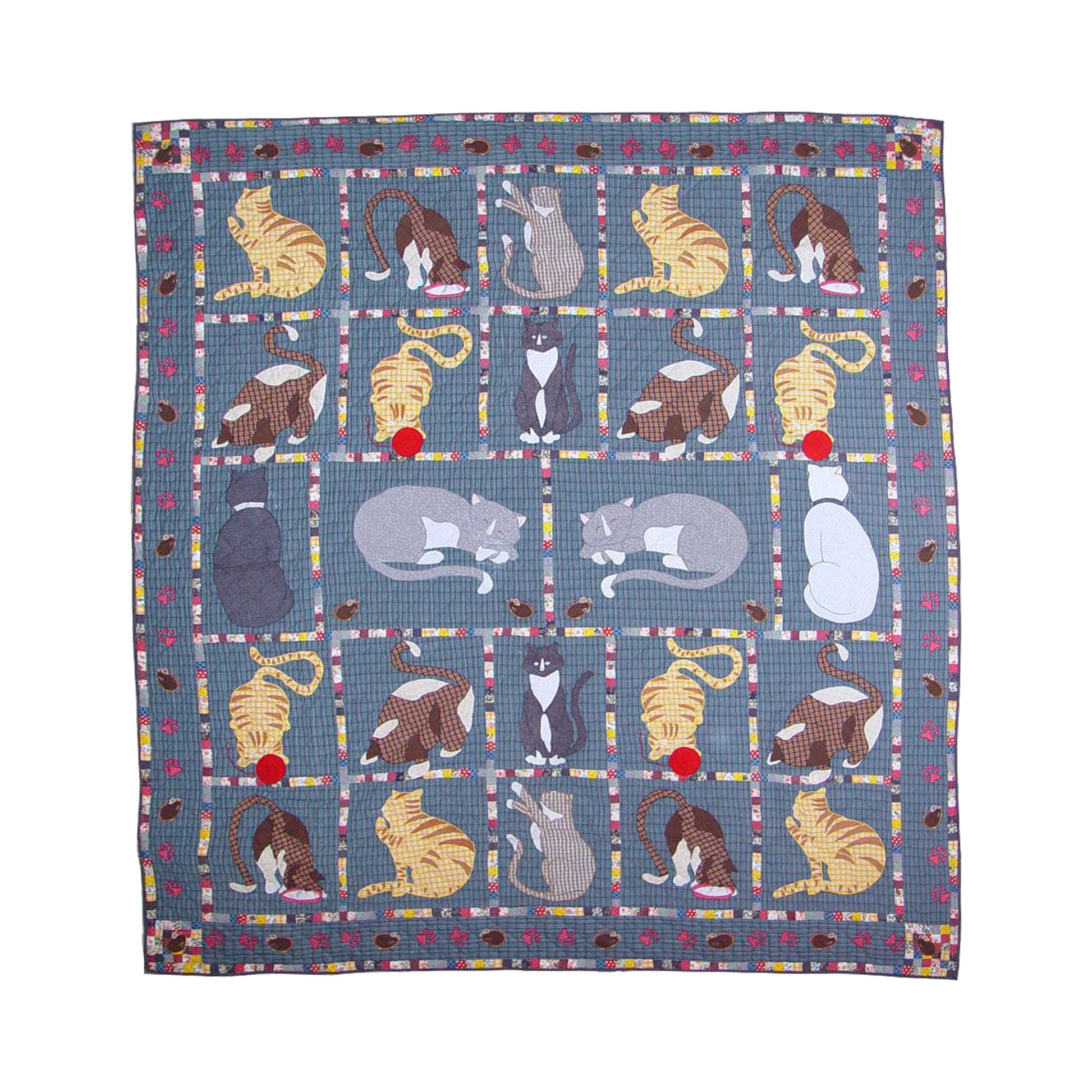 The kittens and cats of all sizes and colors, as well as their antics, entertain cat fans, particularly kids, who will enjoy lying on and sprawling over this Quilt. The fluffed hand-layered organic cotton fill and soft cotton fabric shell are extraordinarily soft, warm, comfortable, and cool. Our quilts are hand appliquéd using real appliqué parts and are not printed. It is hand-quilted rather than machine-quilted. We provide 100% original traditional quilting. The quilt's reverse is composed of homespun cloth, while the backing is made of yarn-dyed fabric.