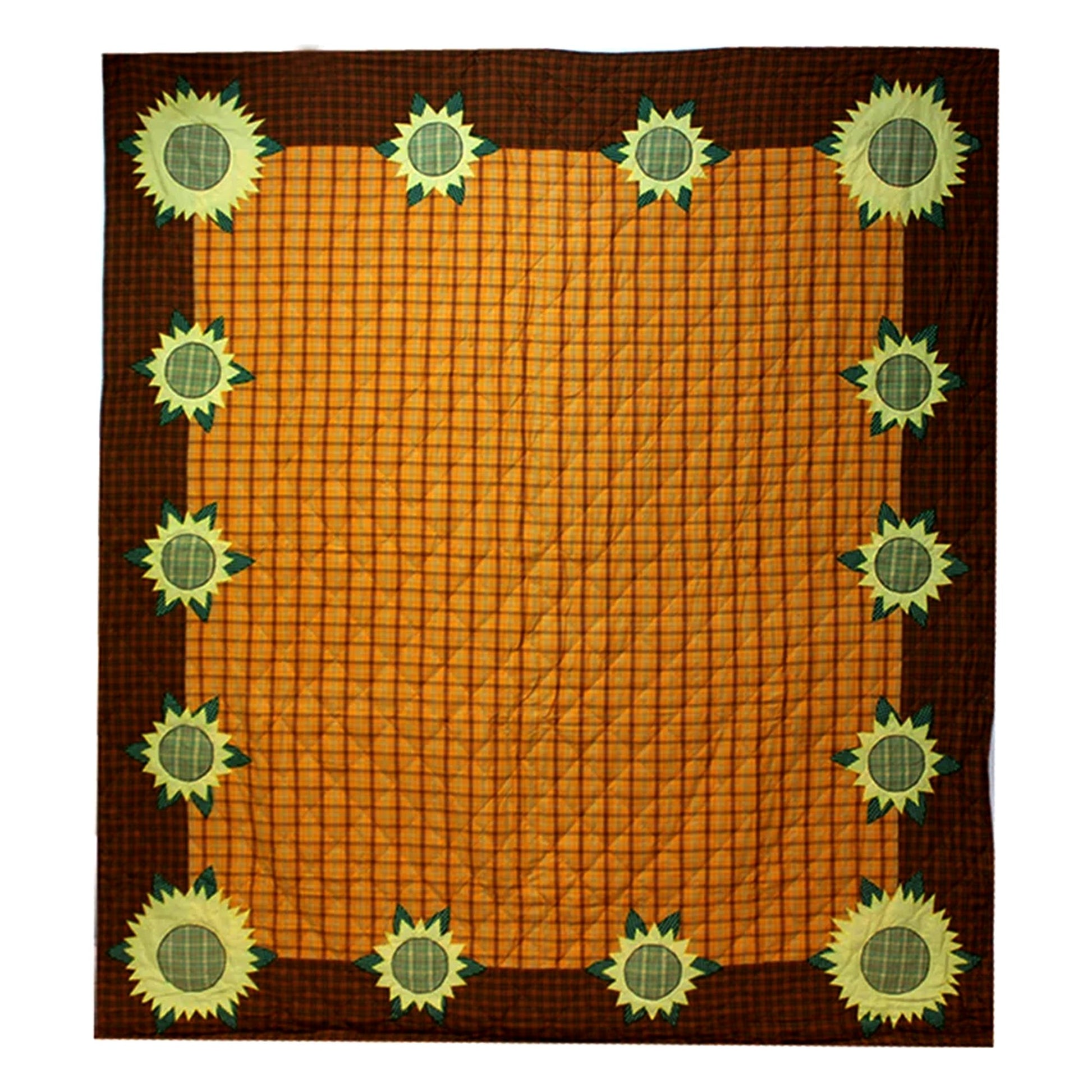 Dazzling yellow sun flowers with a crown of green leaves lying flat face a plaid gold brown border and a summer yellow center and peering at us from this vivid quilt, adds summer cheer to the home.